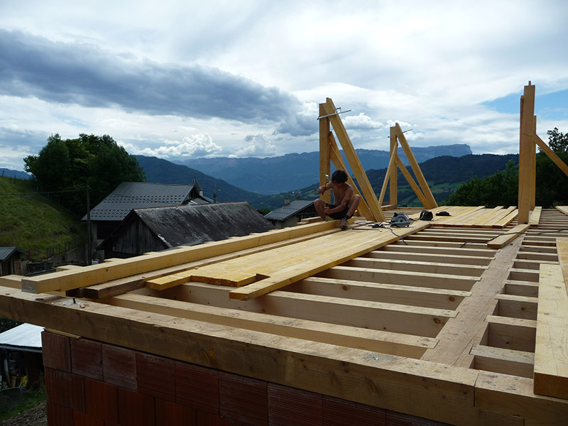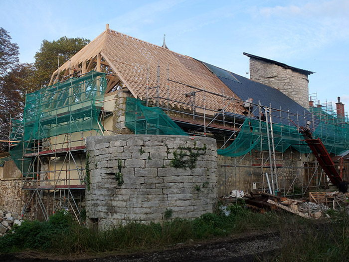 Cognin, château de Villeneuve, reconstruction de la croupe de la grange. Cognin, château de Villeneuve, reconstruction de la croupe de la grange. Cognin, château de Villeneuve, reconstruction de la croupe de la grange. Cognin, château de Villeneuve, reconstruction de la croupe de la grange. Saint Aupre. Grange et son séchoir à noix avant restauration. Saint Aupre. Déversement des fermes et de la couverture sur 80 centimètres. Saint Aupre. Redressement de la charpente au tire fort. Saint Aupre. Saint Aupre. C'est la flèche des entraits retroussés, placés dans le même sens, qui a provoqué le déversement de la charpente. Saint Aupre. Le séchoir à noix. Saint Aupre. La charpente après restauration. Saint Aupre. Redressement du séchoir à noix. Console à tenon traversant.