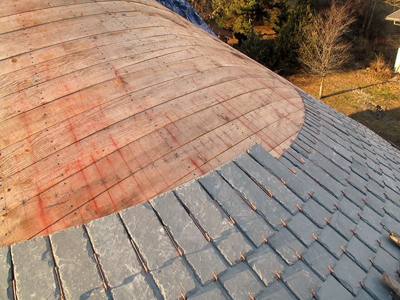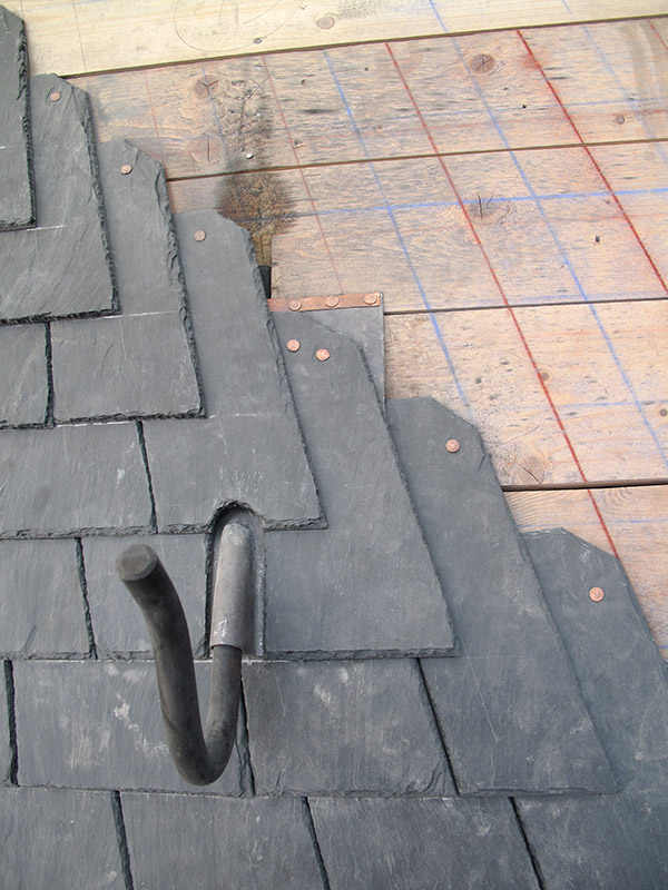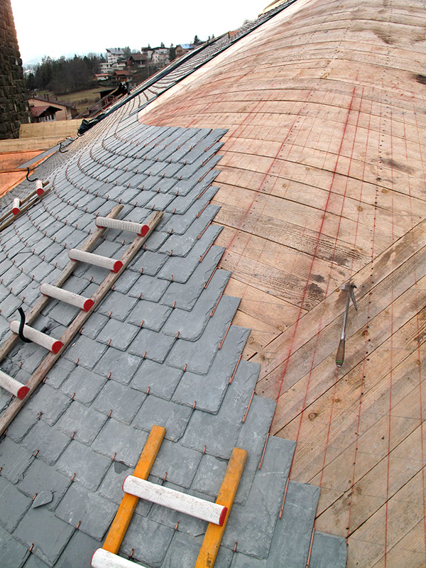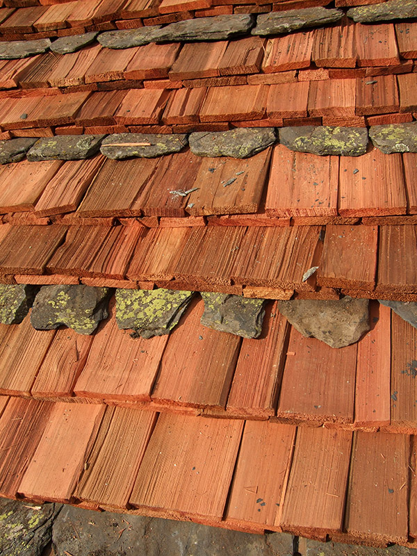 Couverture en tavaillons et lauzes, Bionnassay. Abside gironnée, église Novarina, Passy. Couverture en ardoises du Brésil. Abside gironnée, église Novarina, Passy. Couverture en ardoises du Brésil. Croupe gironnée, basilique de Thonon. Couverture en ardoises d'Angers. Croupe gironnée, basilique de Thonon. Détail: crochet de service. Cheneau rampant basilique de Thonon. Couverture en ardoises d'Angers. Abbaye d'Ambronay, tour des archives. Volige sur dosse. Abbaye d'Ambronay, couverture du clocheton en cuivre étamé.