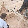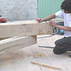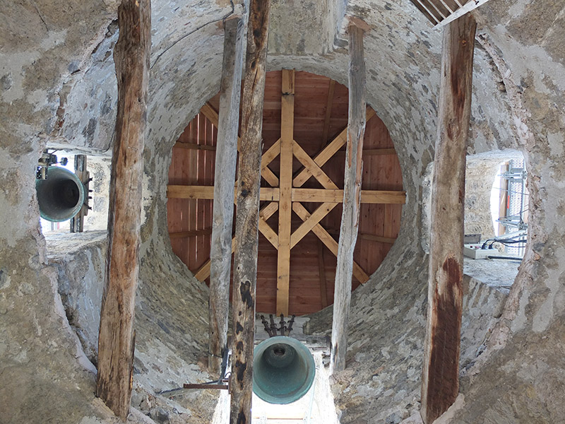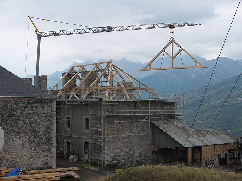 Chapelle des pénitents, la Grave. La charpente après dépose des tableaux et du lambris. On remarque la flèche très importante des pannes. Chapelle des pénitents, la Grave. Taille d'un poinçon. Chapelle des pénitents, la Grave. Poinçon. Chapelle des pénitents, la Grave. Mise en place de la première ferme en sous-oeuvre. Chapelle des pénitents, la Grave. Pose des pannes en sous-oeuvre. Chapelle des pénitents, la Grave. Mise en place de la première ferme en sous-oeuvre. Chapelle des pénitents, la Grave. Entraits assemblés par double moisement. Chapelle des pénitents, la Grave.  Mise en place de la première ferme en sous-oeuvre. Chapelle des pénitents, la Grave. La nouvelle charpente terminée.